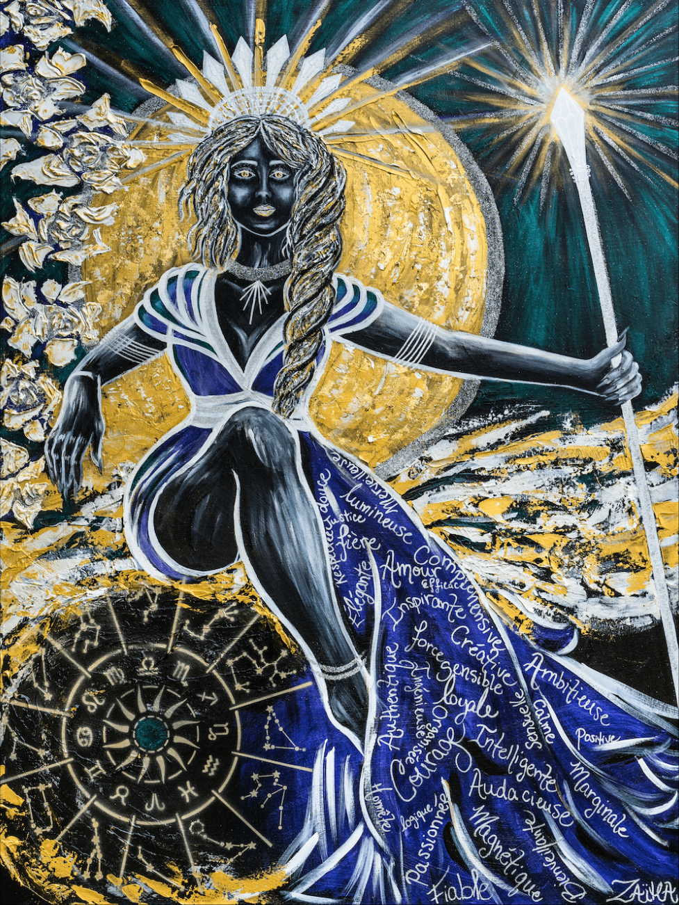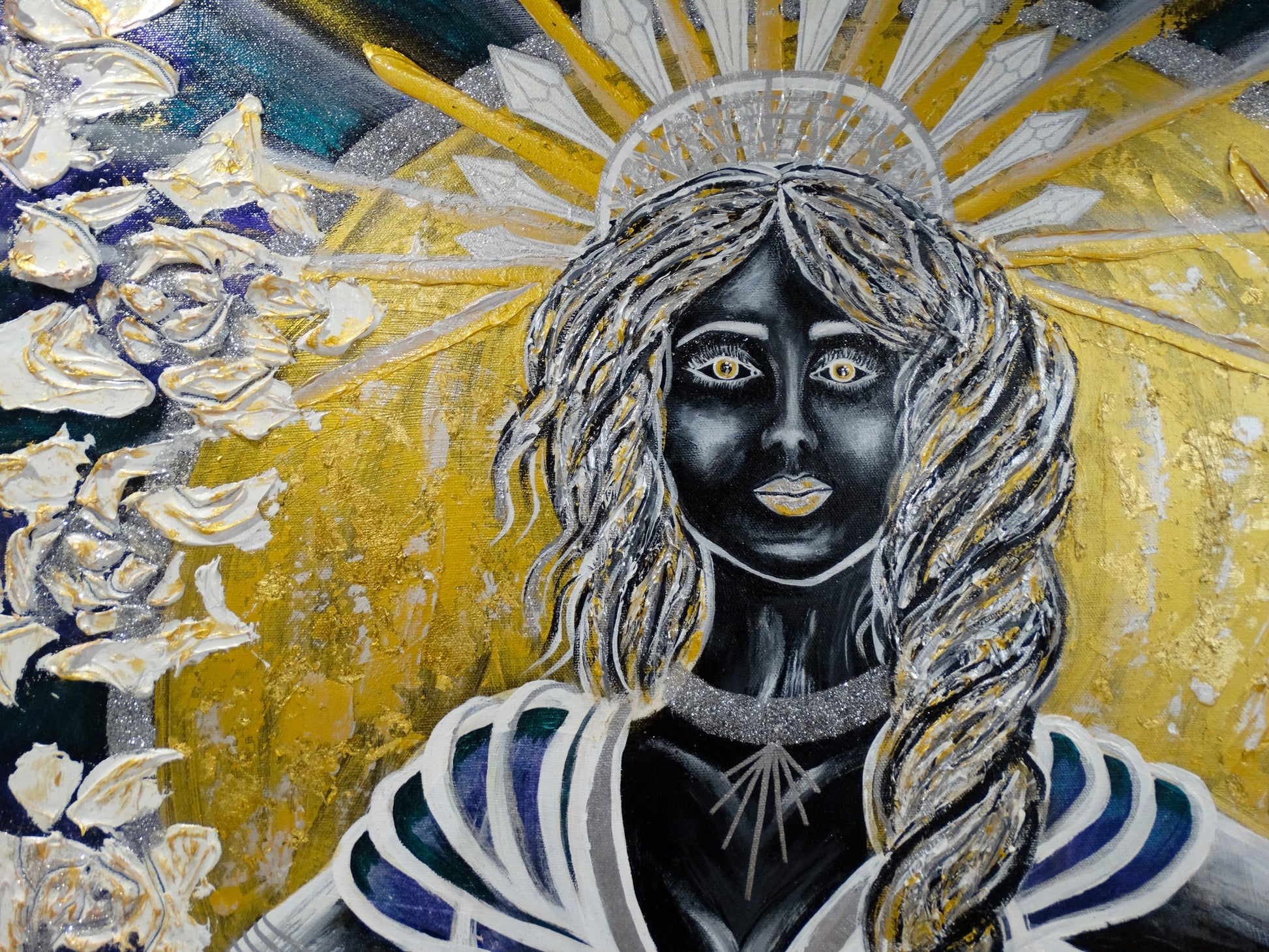 Cette oeuvre a été terminée 3 jours avant l’exposition Célesta, car l’inspiration est venue modifier le visage de la déesse à la toute fin.